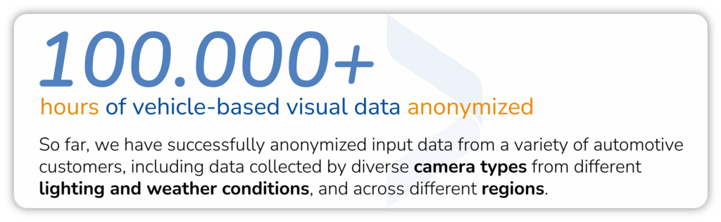 Our approach enables organizations to make use of a resource-efficient and precise alternative to eliminating personal data from collected data. We aim to ensure that our customers and OEM players can accelerate the adoption of connected and autonomous vehicles, while still being able to comply with privacy regulations.