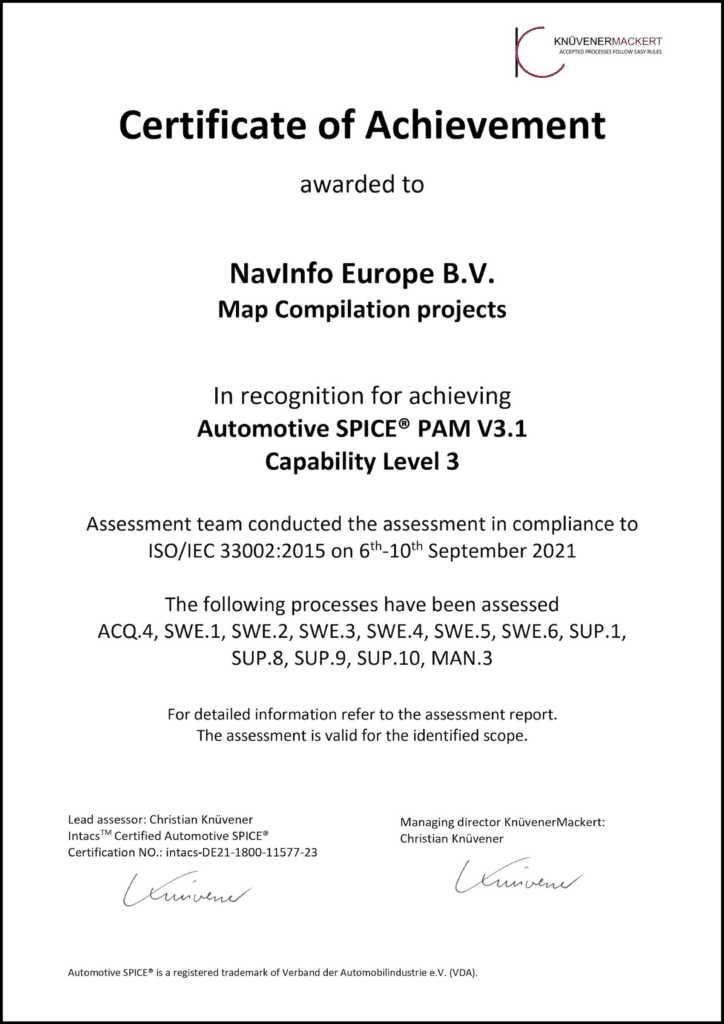 To achieve the certification, NavInfo Europe performed internal assessments, identified improvement points, and implemented the required process enhancements. The ASPICE® assessment was carried out in September 2021 by KnüvenerMackert, an expert team that specializes in Automotive SPICE® assessment, consulting, coaching, and training. The assessment concerned twelve process areas and their capability levels, whereby NavInfo Europe accomplished the “fully achieved” rating for each process.