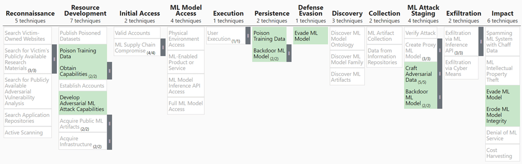 ATLAS is a knowledge base of known adversary tactics and techniques for ML systems, organized in columns progressing from left to right. The columns signify the timeline of an attack, i.e., the steps adversaries must complete to achieve their objective.