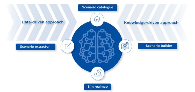 Our comprehensive simulation portfolio combines both Data and Knowledge driven approaches as a unique offering, which includes Scenario Extractor, Scenario Catalogue, Scenario Builder and Simulation RealMap. Each product allows our customers to meet their simulation needs and accomplish their verification and validation goals for ADS testing.